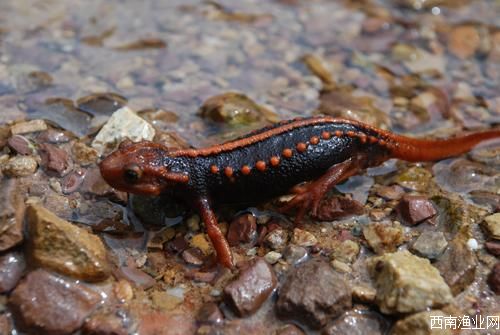 红瘰疣螈,两栖纲有尾目蝾螈亚目蝾螈科疣螈属。体侧、体背面和尾部均有不同大小、分布不均匀的瘰粒。主要分布于中国云南、广西和东南亚地区,生活在海拔1000-2400米林木繁茂、杂草丛生的山区,喜栖息在阴湿环境中。为卵生动物,幼体在水域内生长发育,长大后转为陆栖生活。觅食昆虫、蚯蚓、蜗牛及其它小动物。
