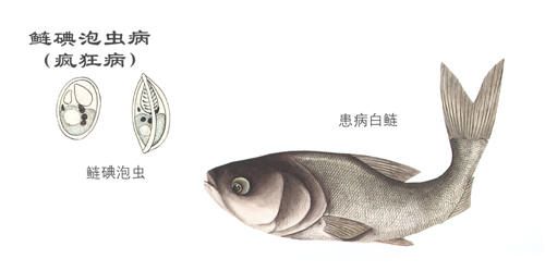 病鱼极度瘦弱,头大尾小,尾部上翘,体重仅为健康鱼的1/2 左右;常在水中离群独自急游打转,常跳出水面,复又钻入水中,如此反复多次而死,死亡时头常钻入泥中;有的侧向一边游泳打转,失去平衡和摄食能力而死,故叫病狂病。病鱼的肝脏、脾脏萎缩,腹腔积水,剖开颅腔可见白色包囊。